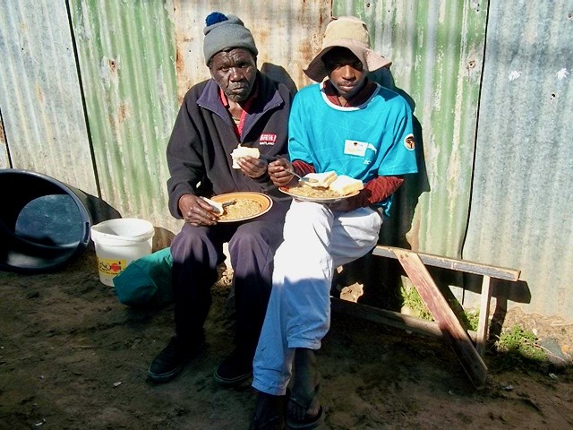 Mnxuba Mthini and Nkosinathi Valashiya eat umngqusho and bread outside the church.