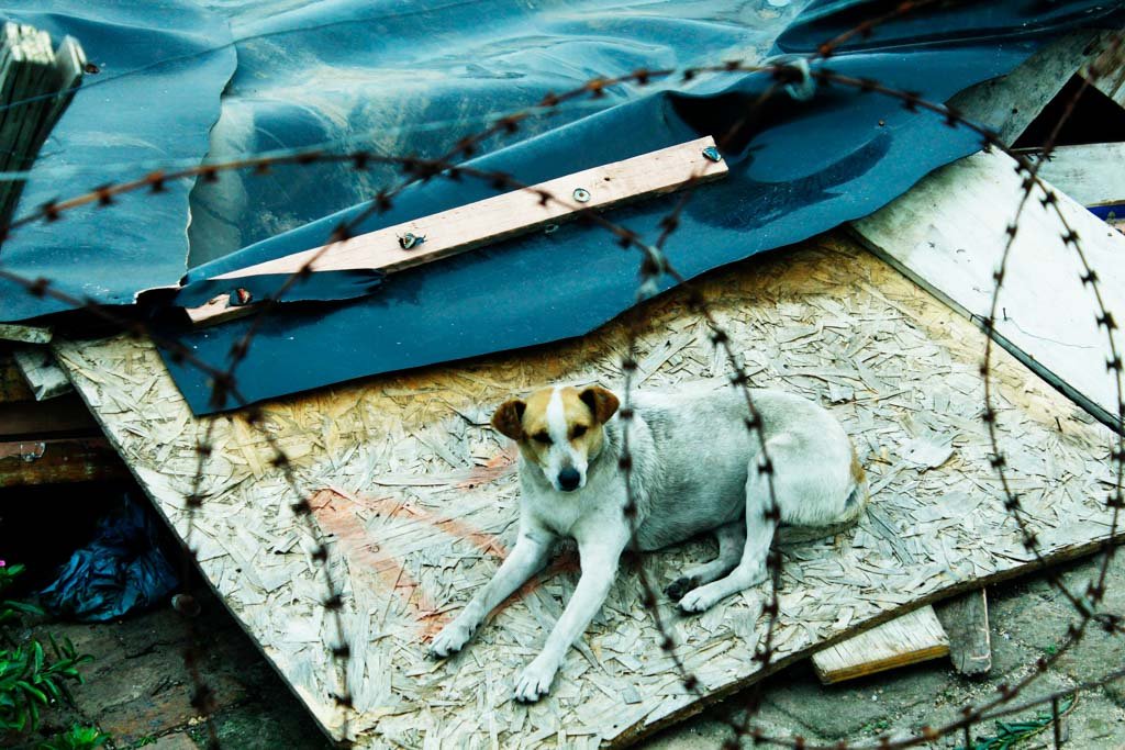 Most of the other dogs wandering about Skandaalkamp look confused and forlorn. One sits curled up in what used to be his owners' home, petrified of the volunteers who come near him to offer food.
