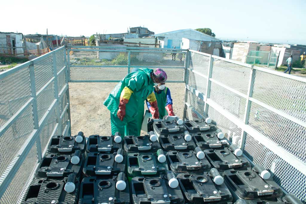 A puller will bring the toilets to an informal collection point agreed to by the community. A driver and helper in a bakkie dispatched by the City contractor will load the toilets to be taken to a cleaning facility in the industrial area of Borcherds Quarry near the airport.