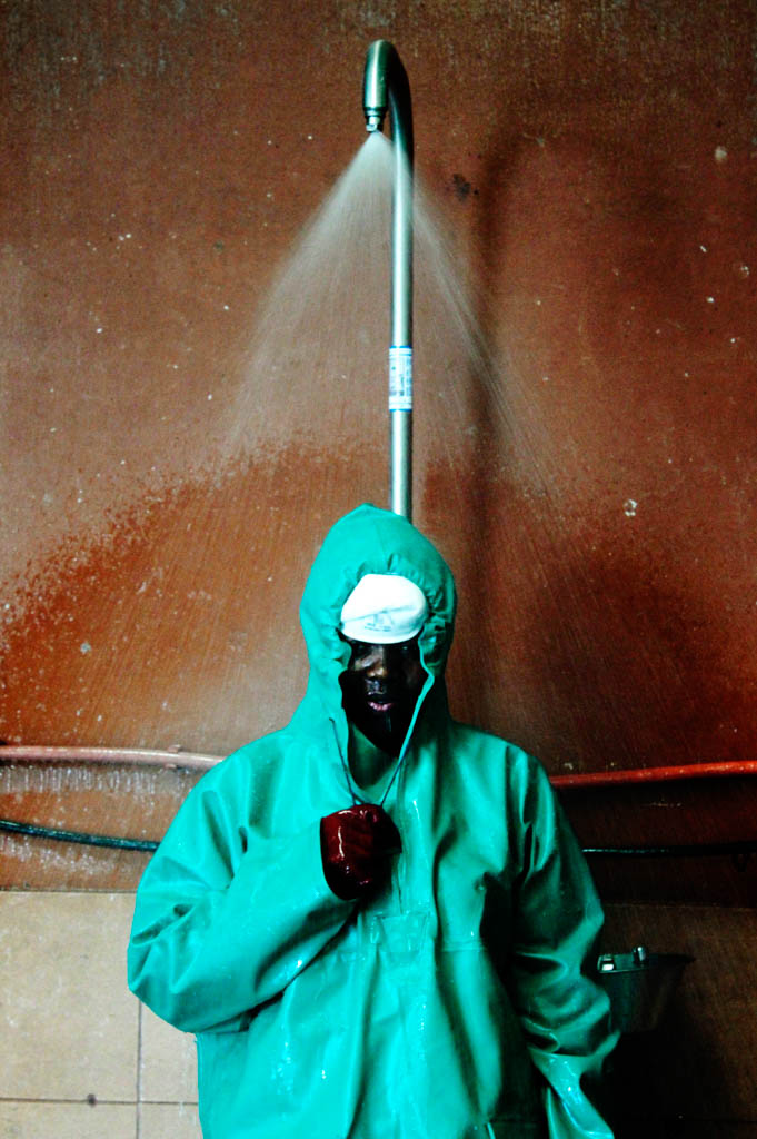 After the cleaning process the workers take turns showering in water mixed with liquid soap.