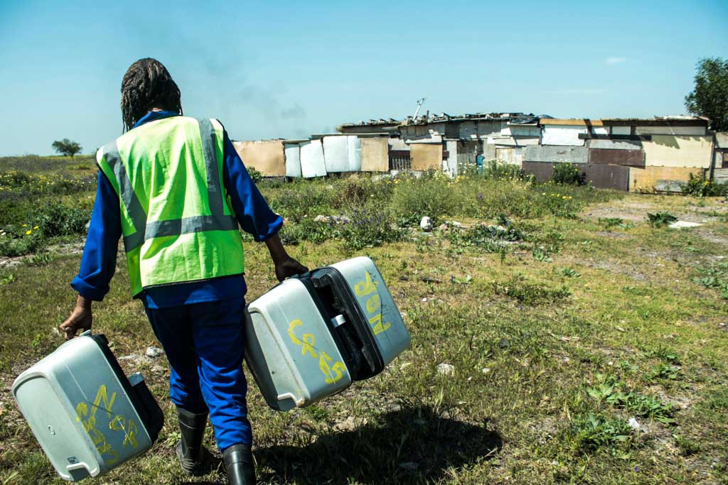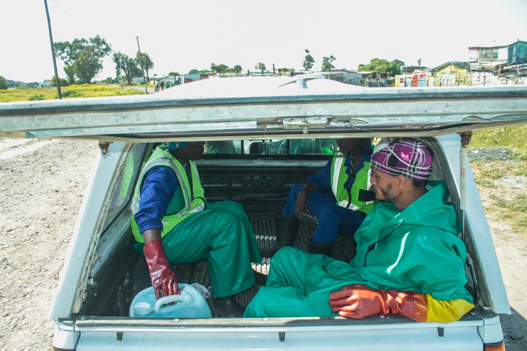 “I have been here for 22 years, so most people know me,” he says. “When I go around collecting pots, I have no problems with dogs. The dogs are also familiar to me.” Fortuin wears protective clothing from head to toe.