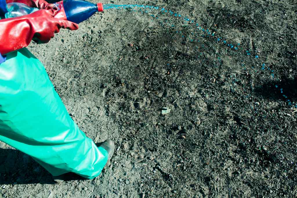 Fortuin sprays disinfectant on the spot where the toilets were collected.