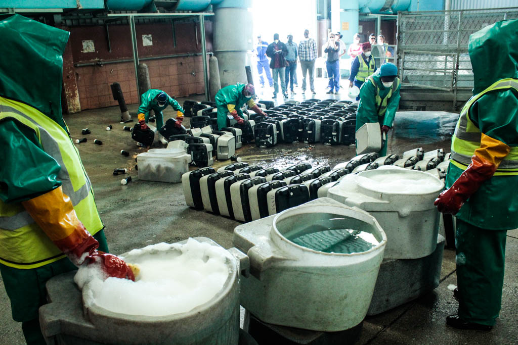 The smell at the collection point in Freedom Farm is unpleasant, but for first-timers, like the GroundUp reporters, the smell at the cleaning facility in Borcherds Quarry is unbearable. It is not just the smell of excrement that is awful; so too is the stench of the cleaning chemicals.