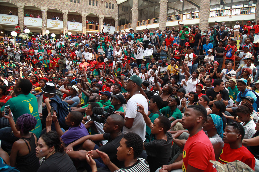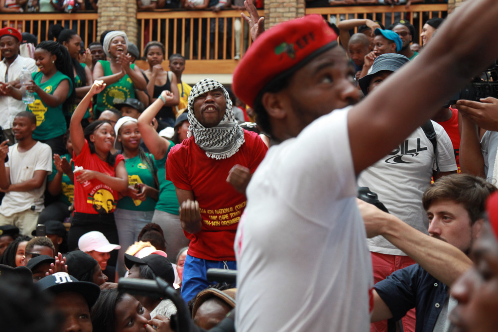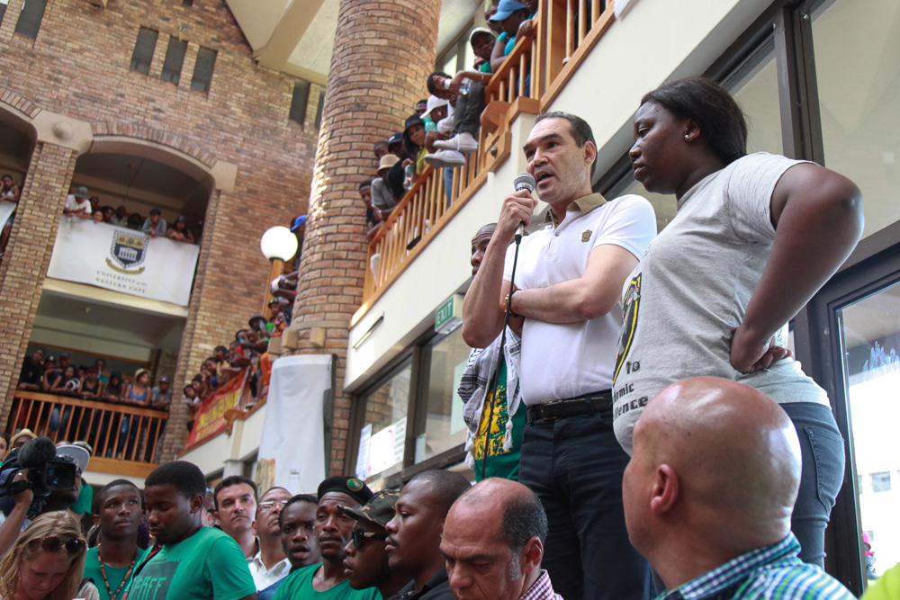 Students gather at the University of Western Cape students centre to listen to rector Tyrone Pretorius.