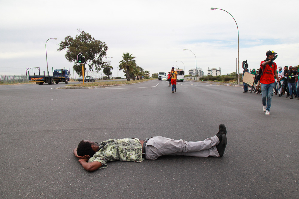 A student lies in the street to block traffic as the protesters march down Robert Sobukwe road towards the Cape Town International Airport.