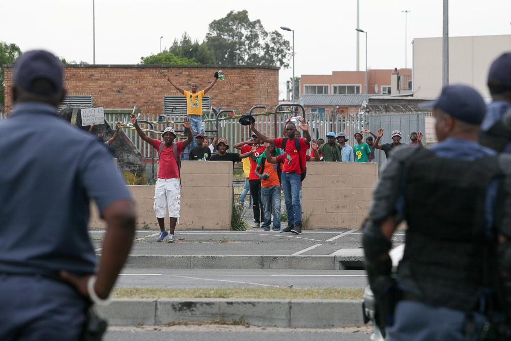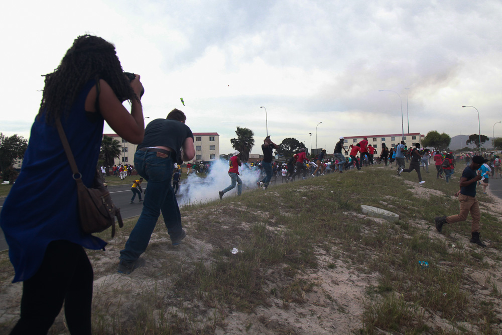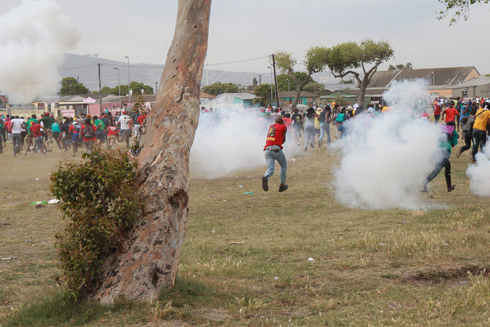 Protesters disperse at Bishop Lavis as riot police fire stun grenades.