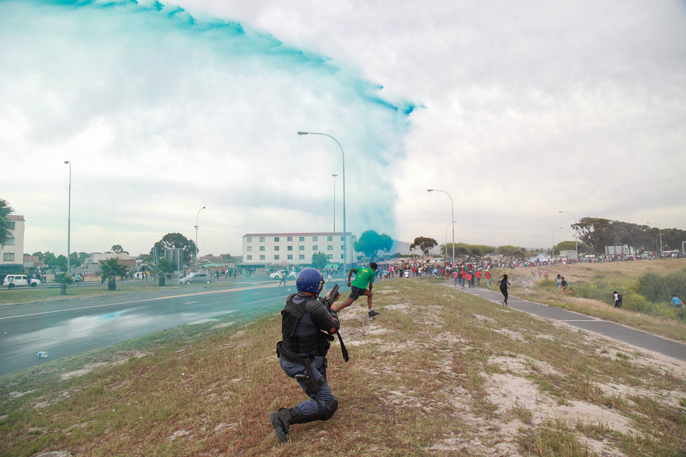 Riot police disperse student protesters with water canons, stun grenades and teargas at Bishop Lavis.