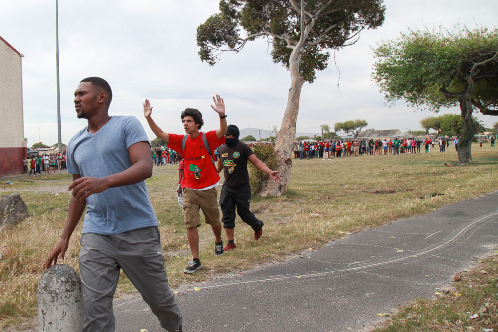 A Student leader raises his hands as he approaches police to talk at Bishop Lavis. The student leadership showed the police an interdict preventing them from using unnecessary force.