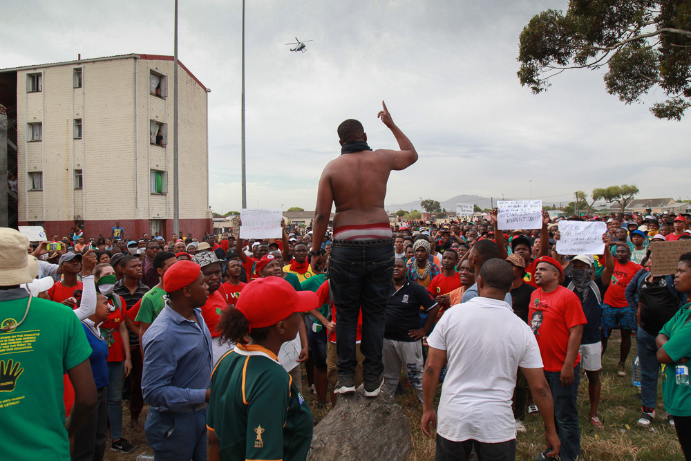 A student leader speaks to students on the grounds next to the flats at Bishop Lavis.