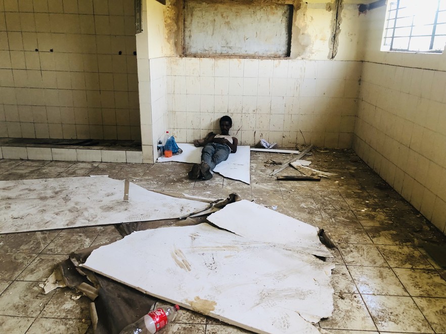 A homeless man sleeps in the ruins of Eldorado Park stadium in January 2025. Park stadiums, soccer fields, and public pools have been badly vandalised and neglected in the area. Photo: Kimberly Mutandiro