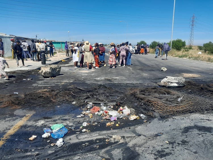 Protesters blocked the busy Saxondown Road in Mfuleni with charred debris and large stones to prevent anti-land invasion officials from evicting them from Sqawunqawu informal settlement.