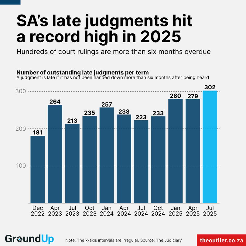 In terms of norms laid out for judges in 2014 by then Chief Justice Mogoeng Mogoeng, judges should hand down rulings within three months of judgment being reserved. We started regularly publishing the number of late judgments in 2018, at one stage even building a database for the public to track late judgments.