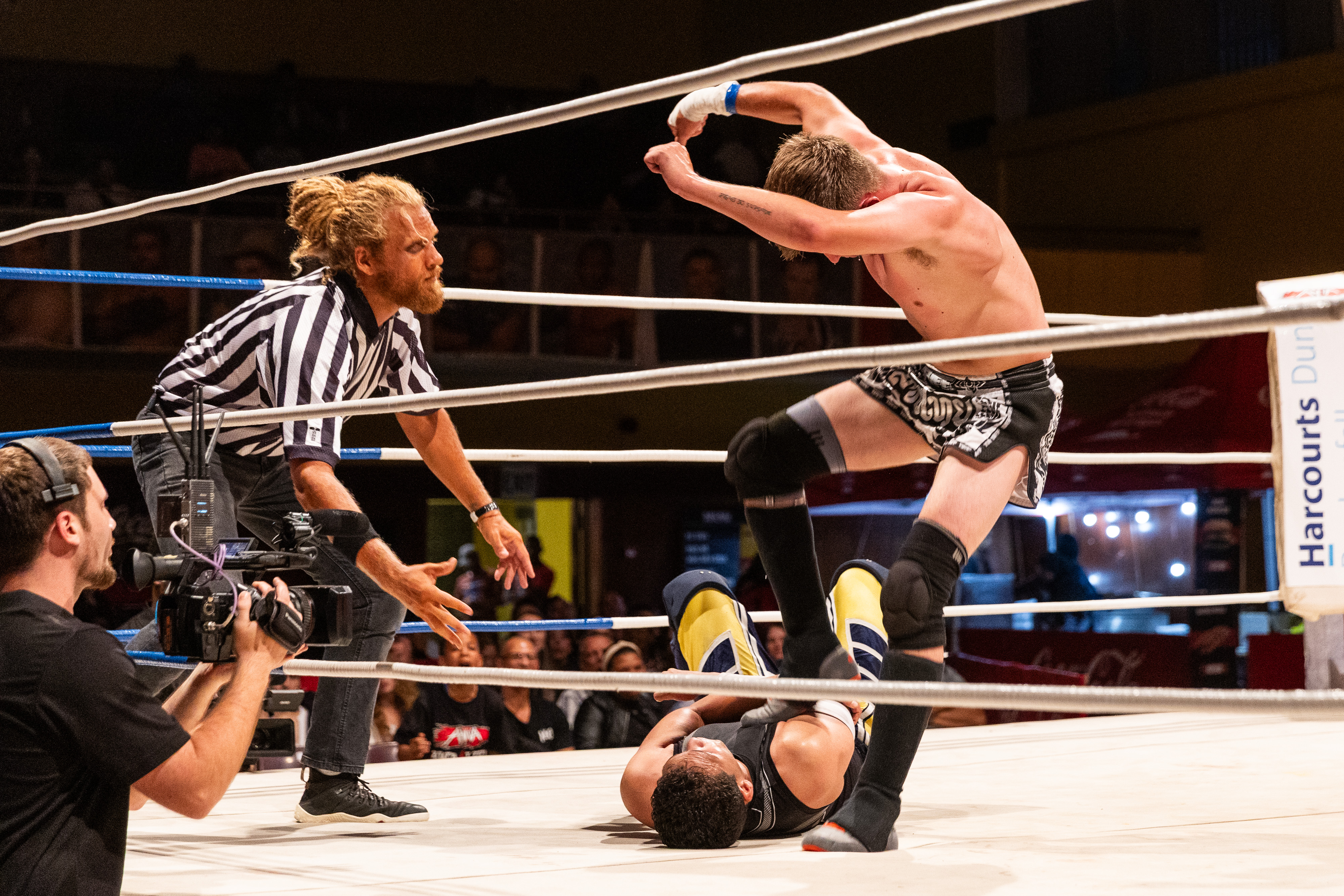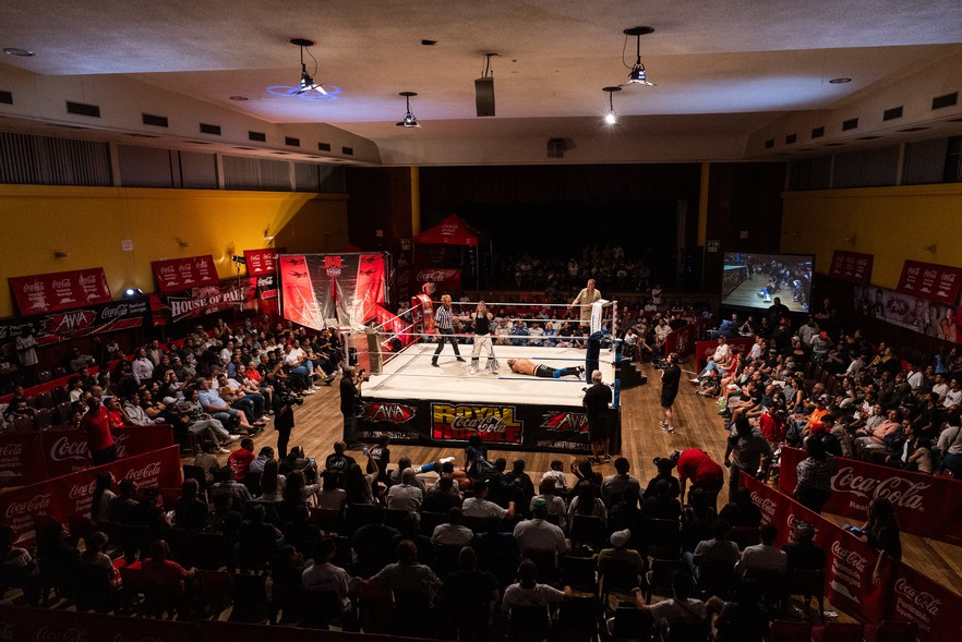 The crowd inside the Parow Civic Centre watches as Revyv and Jan die Skaapboer battle The Takeover (Alex Prince and Chad Lebron) for the new AWA tag team championship belt.