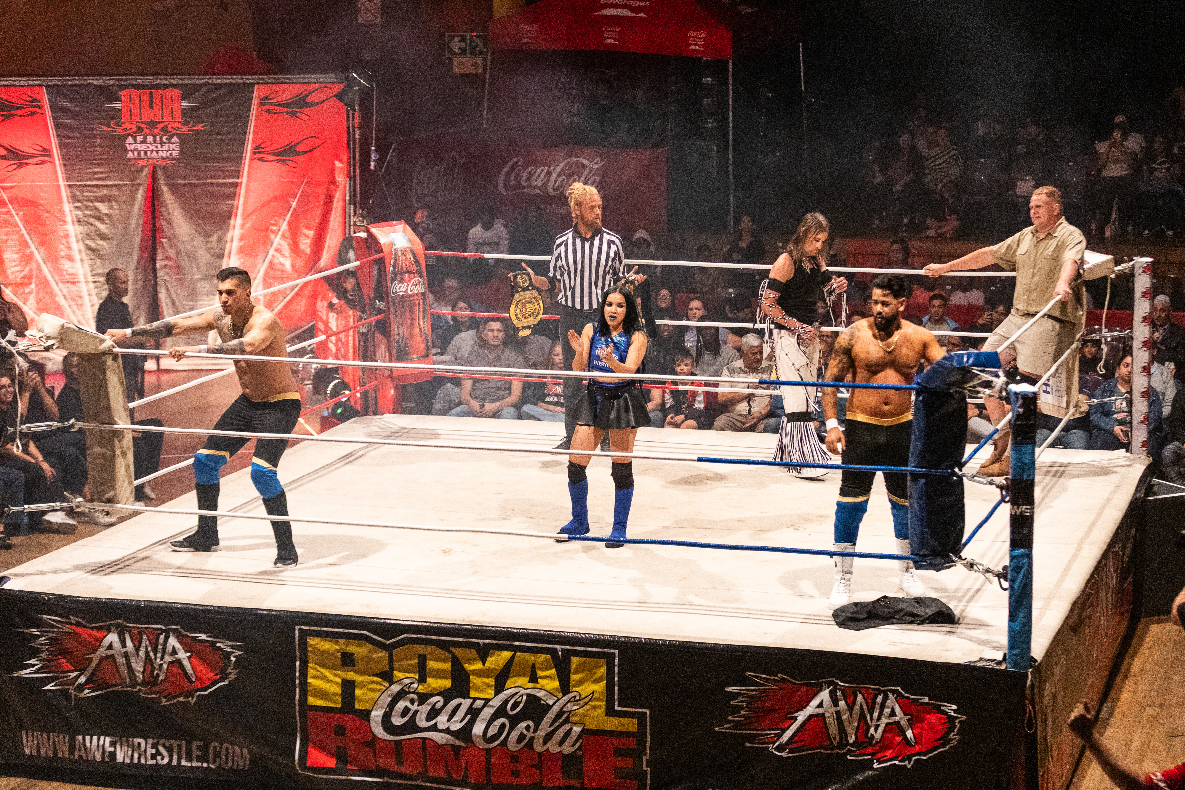 It is 8pm on Tuesday, 2 December. The Africa Wrestling Alliance (AWA) is hosting its final event of the year. After several matches, the evening will conclude with the “Coca-Cola Royal Rumble”, a match in which more than 20 professional wrestlers, each a unique character, will enter the ring and battle one another, testing their physical resolve. One by one, they will be thrown over the ring ropes by their opponents and be eliminated. The last remaining wrestler will win.
