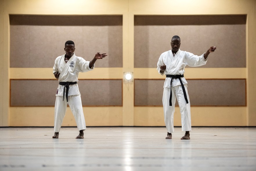 Students perform a kata during a training session held at the Zolani Centre. Practicing various katas regularly develops skill, strength, balance, coordination and overall fitness.