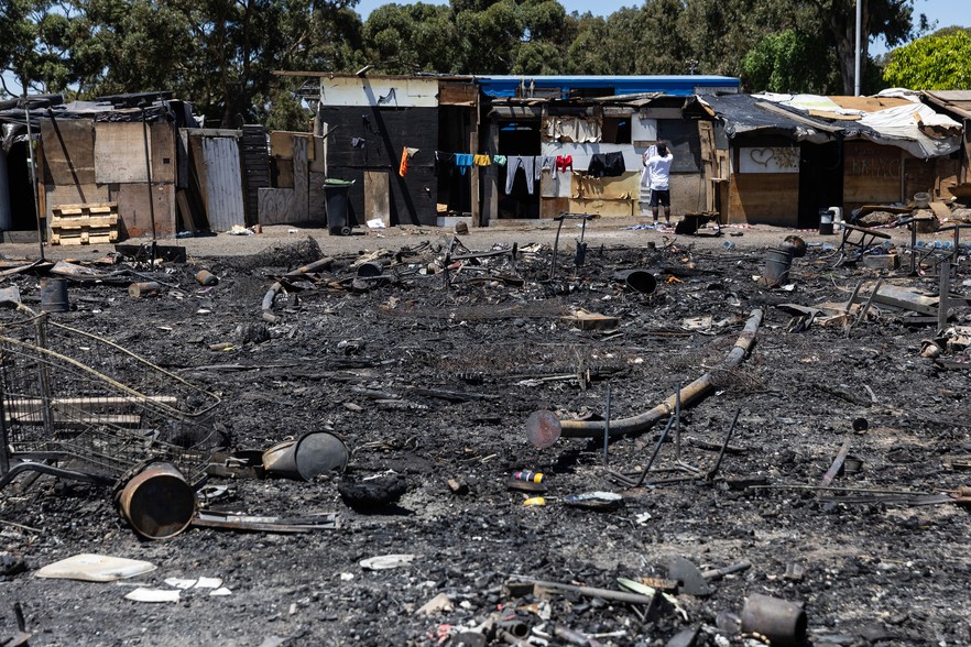 When GroundUp arrived on the scene on Friday morning, we saw a large contingent of law enforcement vehicles and a fire engine. The mobile toilets were burnt and the marquee tent destroyed. Some of the surrounding informal structures were relatively undamaged. Teams were busy with mop-up operations. Gift of the Givers were on site to provide aid. The local ward councillor was speaking to some of the people affected.