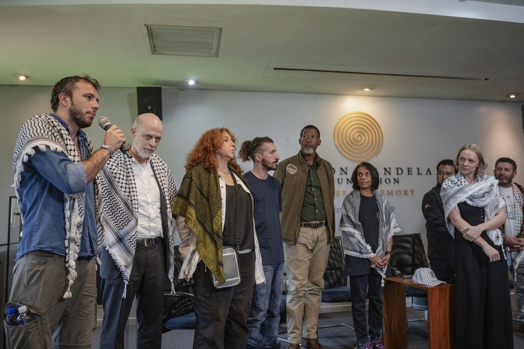 Thiago Ávila (far left), one of the main organisers of the Global Sumud Flotilla speaking during a media briefing at the Nelson Mandela Foundation where they announced the flotilla’s 2026 mission.