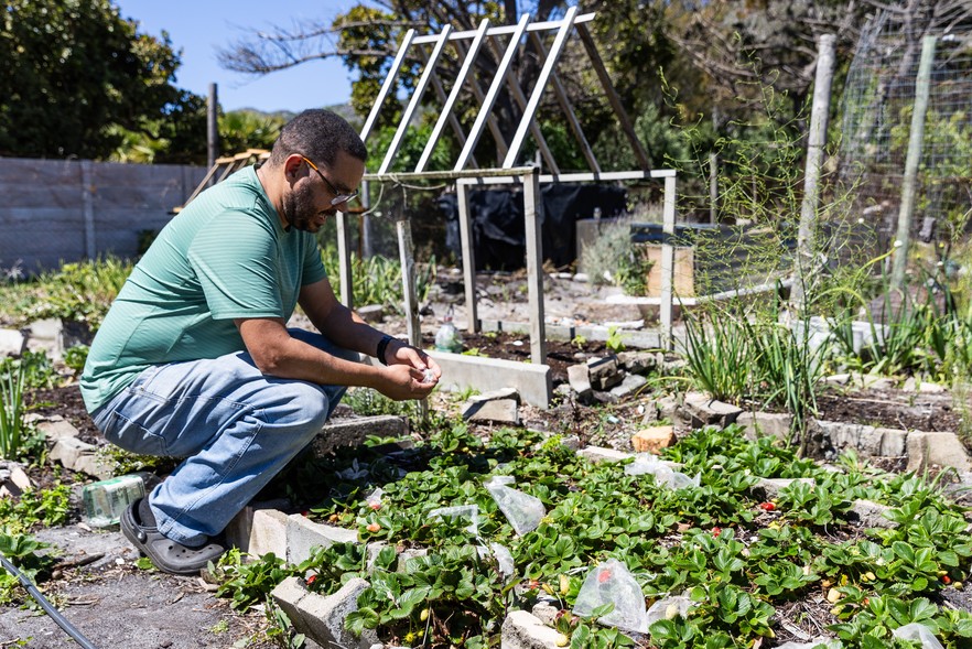 Edwin Fransman picks strawberries from the garden at the small school he runs in the Lochiel smallholdings. Photos: Ashraf Hendricks