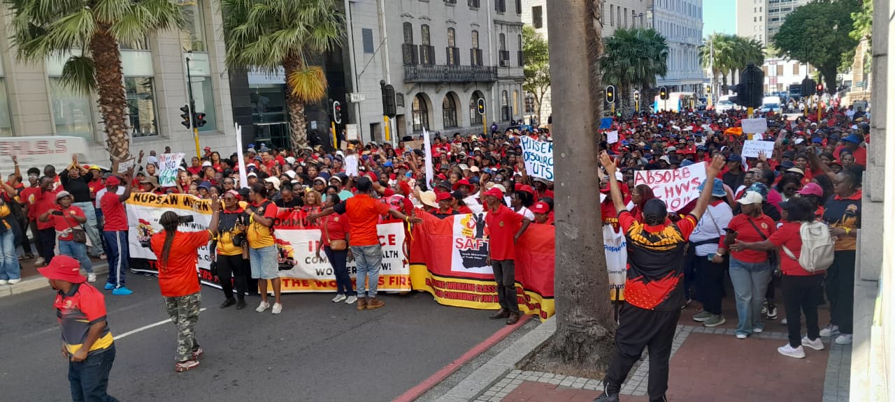 Members of the National Union of Public Service and Allied Workers (NUPSAW) marched to the provincial legislature to demand that community health workers be insourced by the Western Cape government. Photo: Vincent Lali