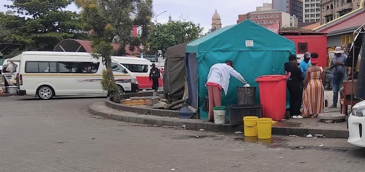 At the bus rank, a tent has been set up with buckets and users have to pay to use them. Bongani Ndaba, who set up the tent, said when he saw that the public toilets had been locked and the building contractor had left the site, he decided to help commuters who had been forced to relieve themselves next to the wall.