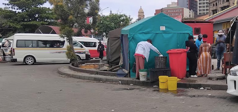 At the bus rank, a tent has been set up with buckets and users have to pay to use them. Bongani Ndaba, who set up the tent, said when he saw that the public toilets had been locked and the building contractor had left the site, he decided to help commuters who had been forced to relieve themselves next to the wall.