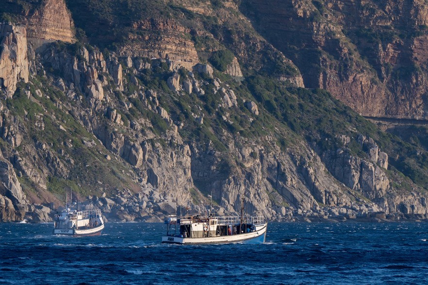 Two long-line fishing boats head out from Hout Bay harbour below Chapmans Peak. While long-line fishermen continue to work outside of the natural trawl grounds targeting both Kingklip and Hake species, traditional purse-seine fishing has closed for the year as the lowered quota limits were met months ago.
