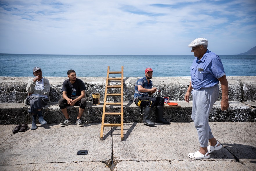 Boat owner and Kalk Bay fishing industry legend Kobus Poggenpoel (right) walks along the quay, greeting skipper ‘Beenie’ Emandien (left) and his two grandsons Laeeq and Obaide. Kobus and Beenie grew up fishing in False Bay with their fathers and grandfathers. Kobus’ family lived in the Kalk Bay village until they were forced to move to Ocean View in the 1960s under the Group Areas Act.