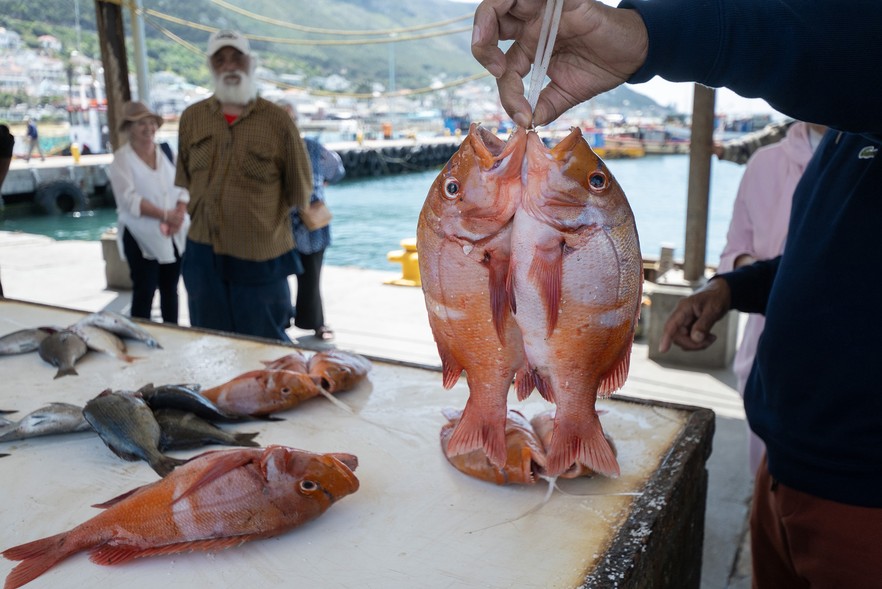 A fishmonger holds up two Red Roman sea bream at Kalk Bay harbour. The small catch just unloaded from a ski-boat at the quay is a far cry from the once bustling fish market that existed at Kalk Bay harbour. Many generations of fishers worked every day from Kalk Bay and were able to raise their children. But today, with declines in fishing stocks, harbours like Kalk Bay focus more on tourism.