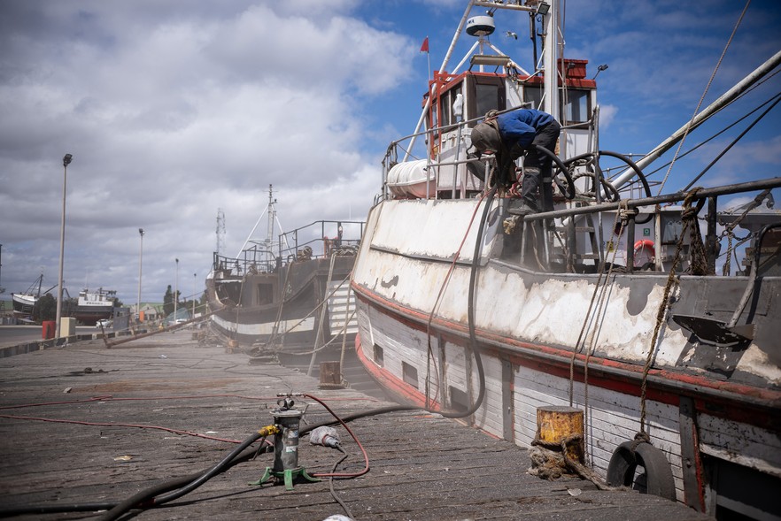 An old fishing boat on a wooden dry dock for maintenance at the Laaiplek harbour. Many fishermen have not worked for months. Larger fishing companies are also feeling the pinch, with possible factory closures along the coast in Gansbaai, Mossel Bay, and St Helena Bay.