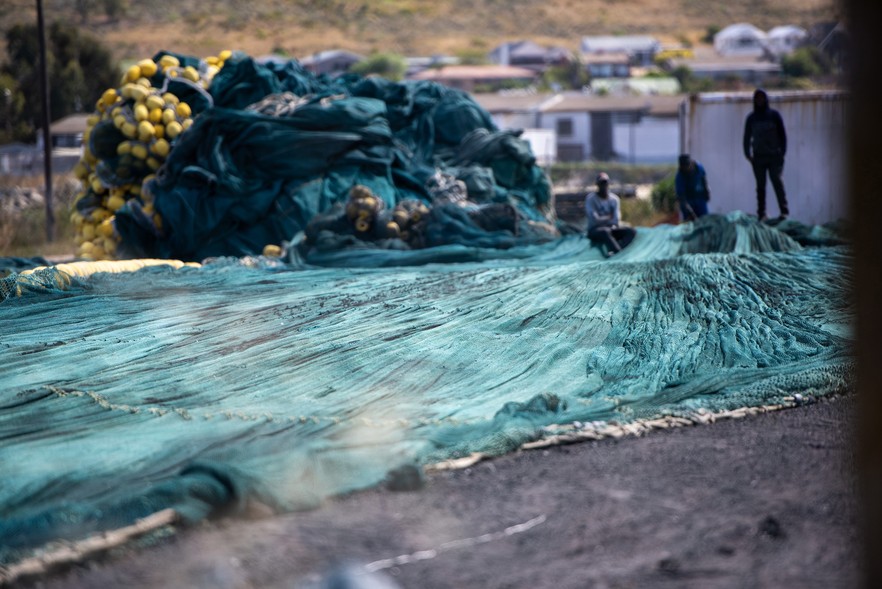 Workers repairing a net in St Helena Bay harbour. The purse-seine fishing industry has been in decline in recent years due to depleting pelagic fish stocks, resulting in strict quotas, particularly for pilchards and sardines.