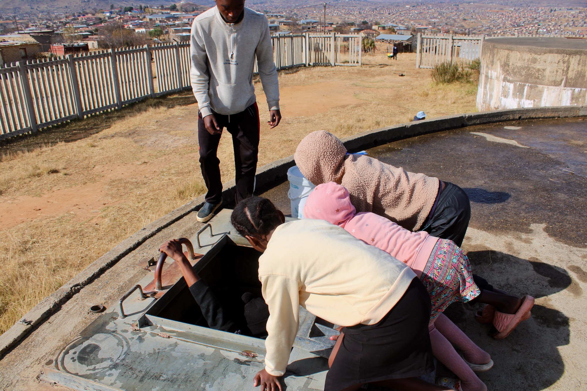 Children watch a brave resident enter the Qholaqwhe reservoir to get water.