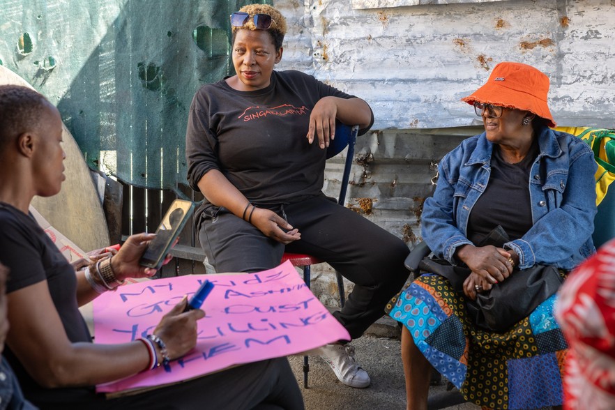 Sinazo Jordan (centre), was one of the first people to move to the settlement. She says life is tough without basic services.
