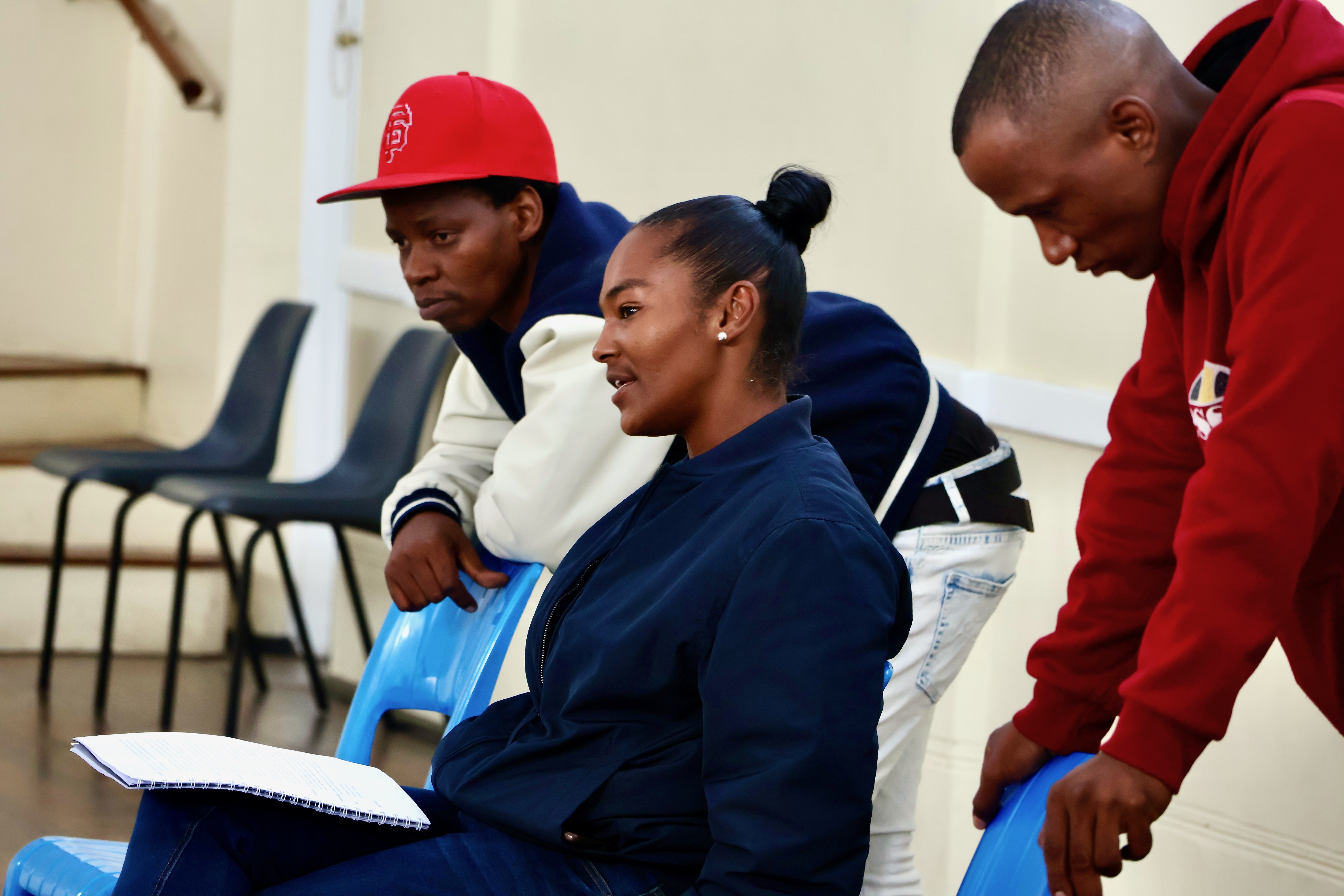 Jonathan Manuel, Staysher Julies and Cyprian Manqola rehearse their performance of “Humans of the streets”. Photos: Matthew Hirsch