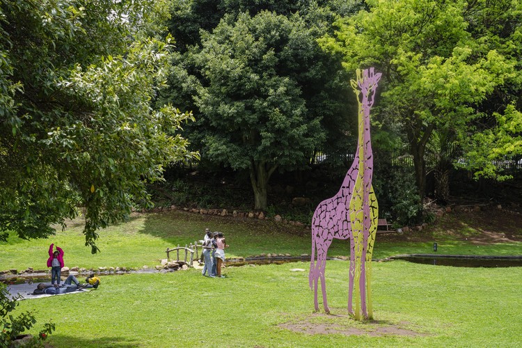 Visitors relax in The Wilds near an artwork produced by James Delaney, a 5 metre high pink and yellow giraffe. This area is called Giraffe Lawn.
