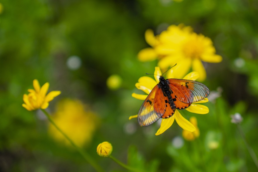 A brightly coloured butterfly, a garden acraea or tuinrootjie, sits on a yellow flower at The Wilds.