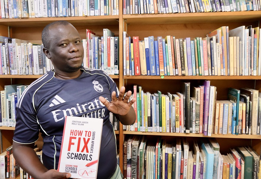 Nhlanhla Tsela, head librarian at the White River Public Library, holds one of his favourite books. Libraries play an important role in bridging the literacy gap.