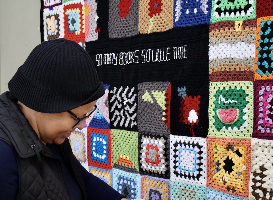 Librarian Penny Green with a blanket donated to the White River public library to celebrate its reopening. The blanket was crocheted by a local group of 67 Blankets for Nelson Mandela Day, with each square representing a beloved book.