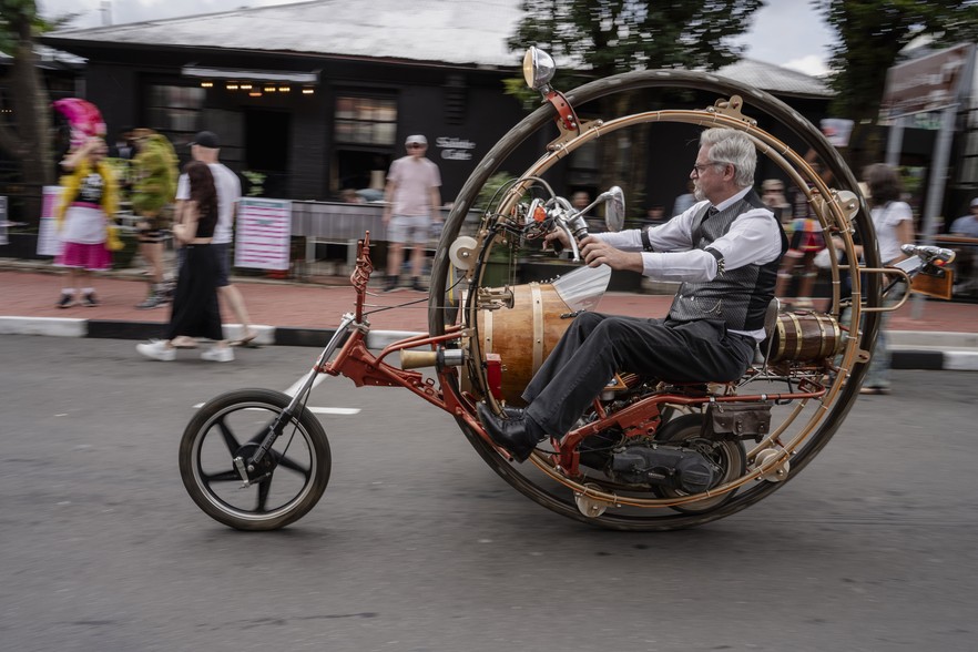 Sebastian Oldsmith rides his quirky vehicle which he calls the Quinta Cyclic Petro Keg through the streets of Melville.