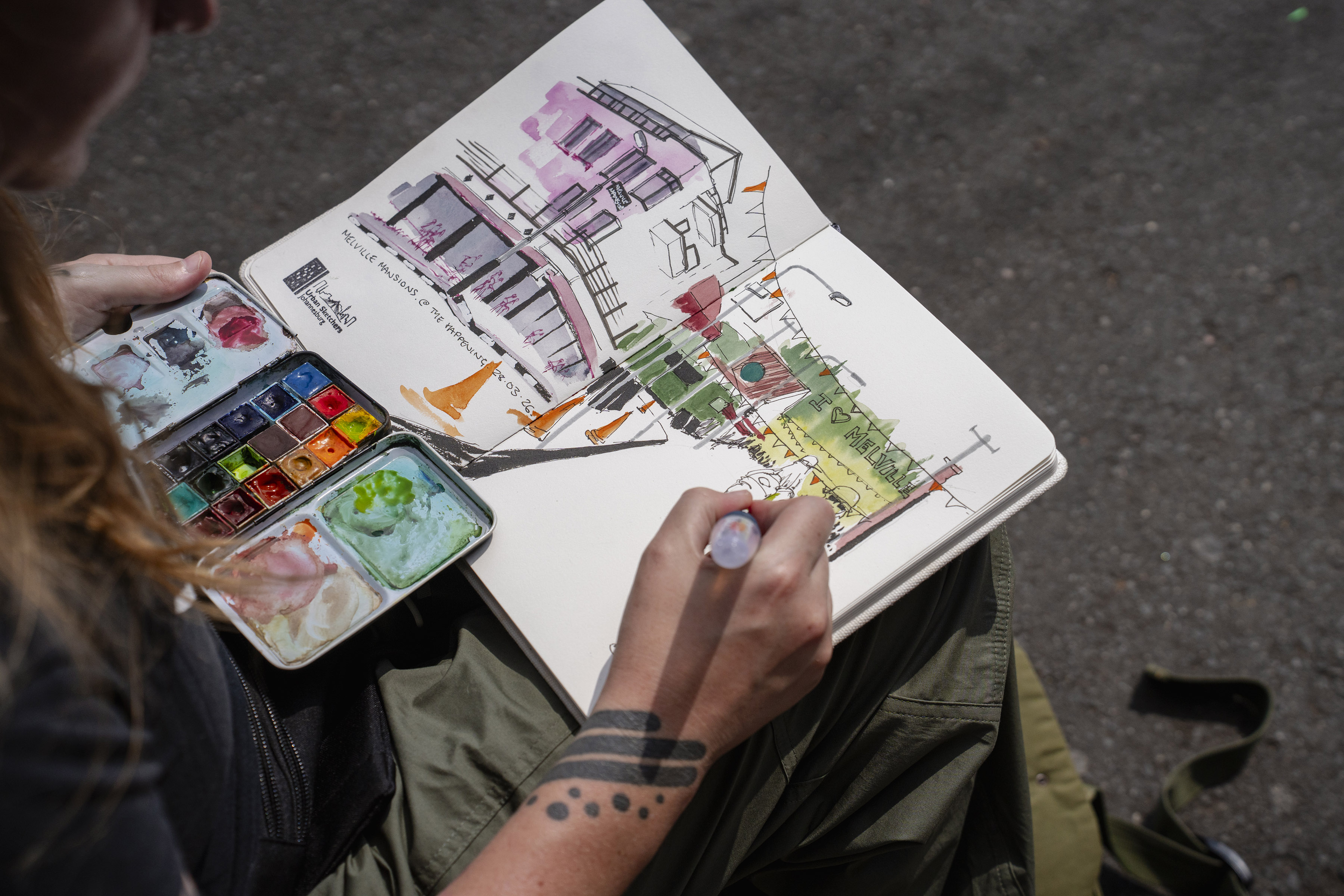 Artist Taria Dawson sketches a street scene depicting 7th Street in Melville.