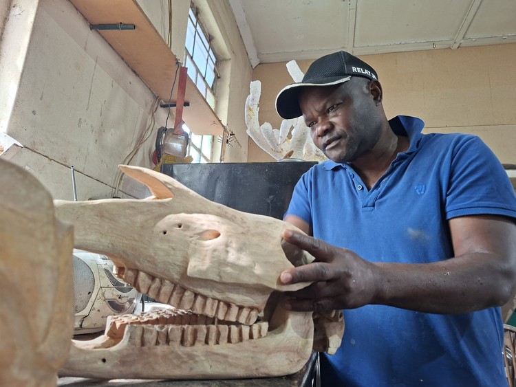 Artist Friday Mbwana works on a sculpture. He is one of several artists with workshops in the Oude Molen Eco Village.