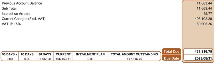 Sections of two municipal bills that Bot’s rental business has received: over R477,000 due end of August 2023 and over R2.9-million due end of April.