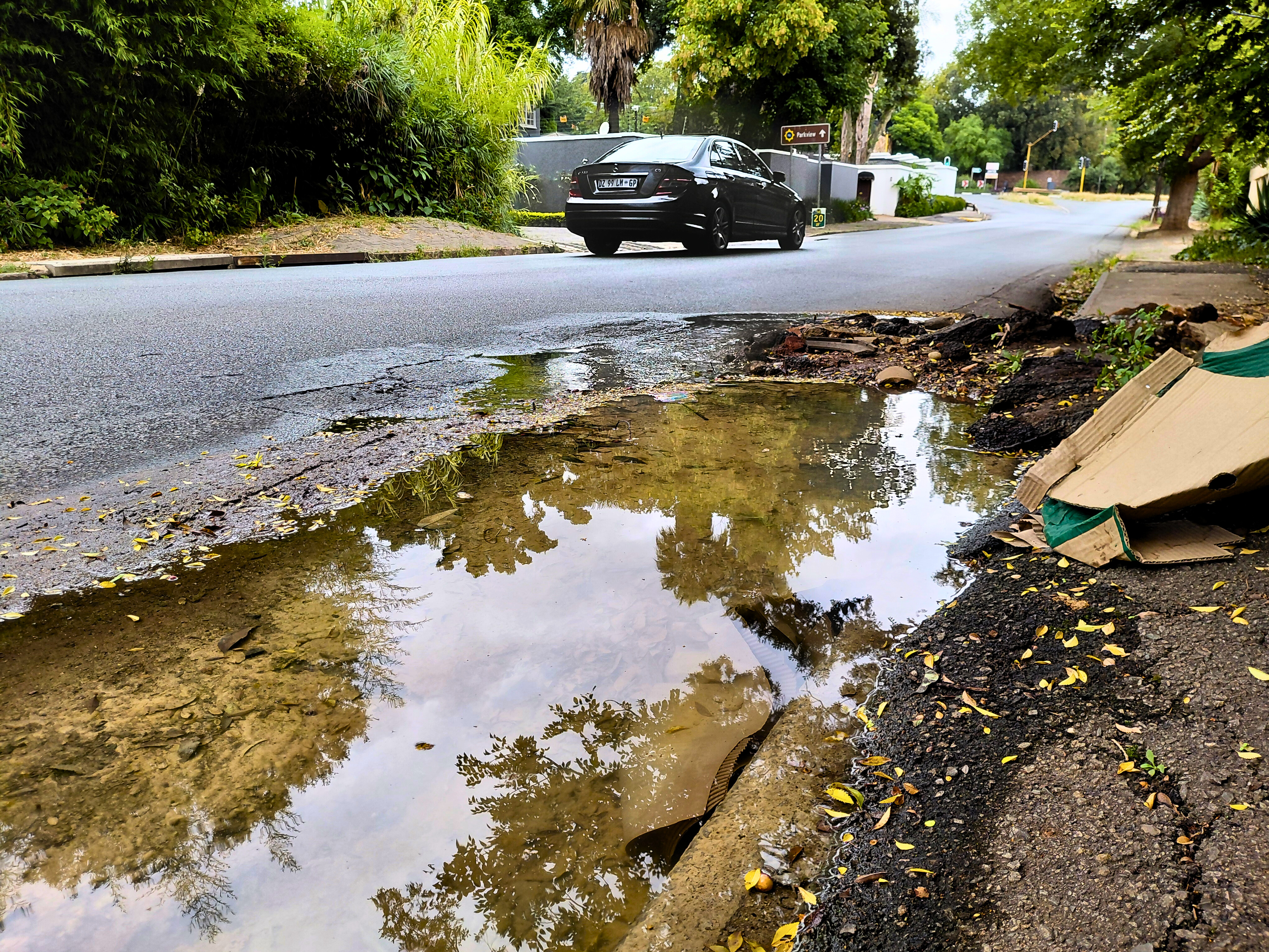 Water from a leaking pipe pools up next to a street in Johannesburg. Photo: Seth Thorne