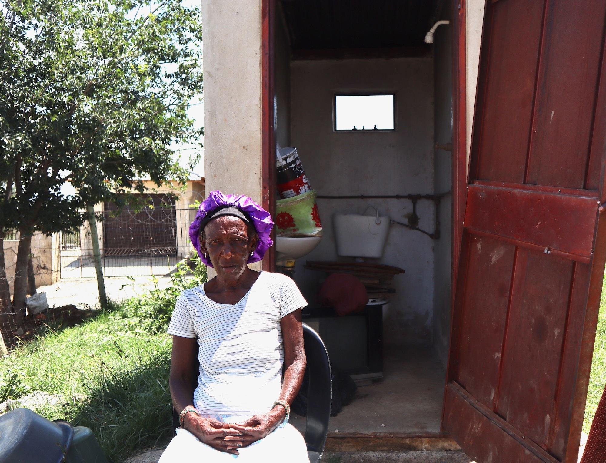 Dunoma Sabisa, a pensioner and resident for over 20 years, said her top structure was completed in 2019 but the toilet has never been connected to water. Her six grandchildren still have to use a longdrop pit latrine which is often full. She has to pay someone to empty it.