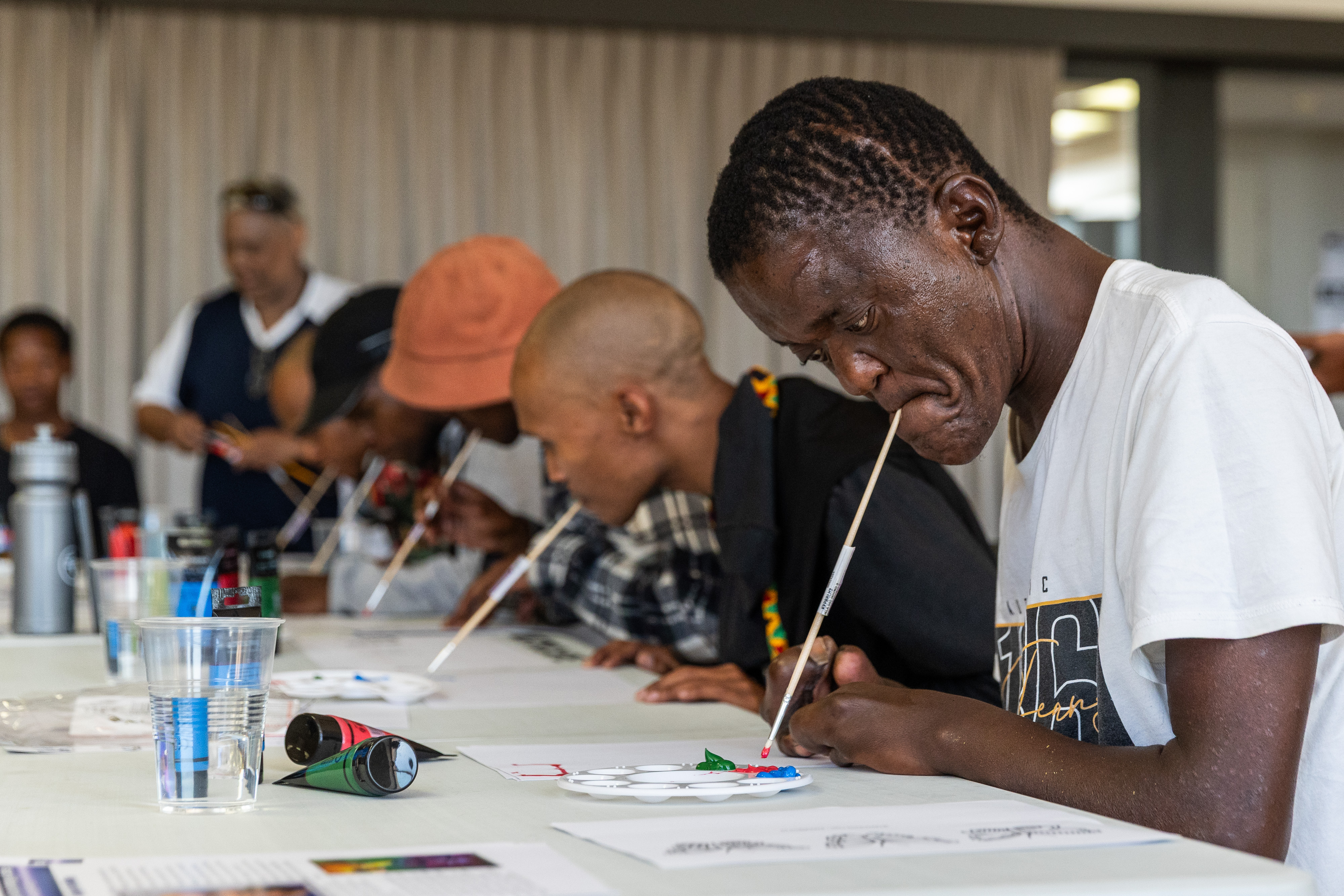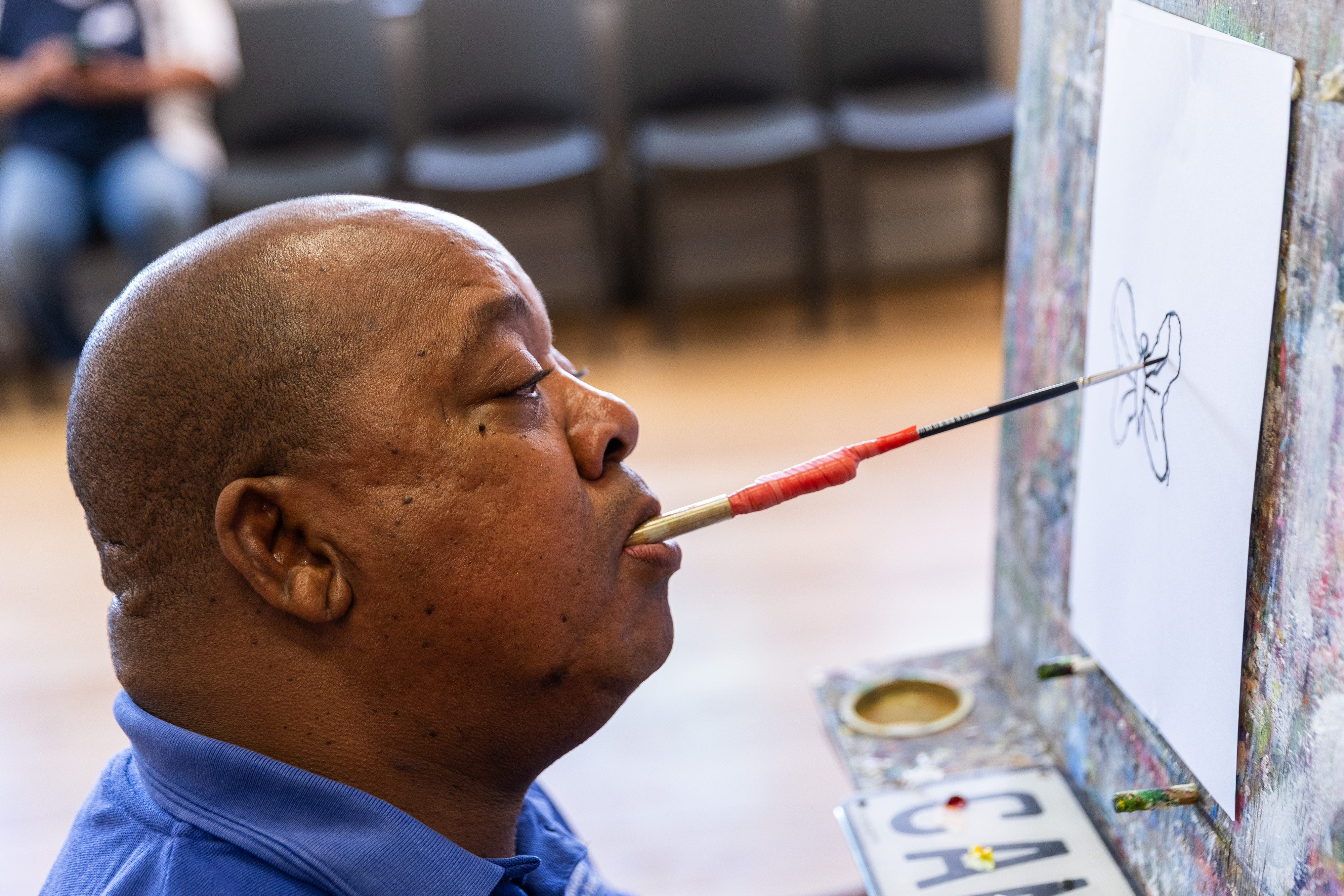 One of the activities still hosted at the Artscape Theatre was a painting class hosted by Brenton Swartz, who is paraplegic and paints using only his mouth. Swartz is a mouth artist. Paralysed from the neck down due to a gunshot accident in 1994, Swartz is wheelchair bound and uses his mouth to paint.