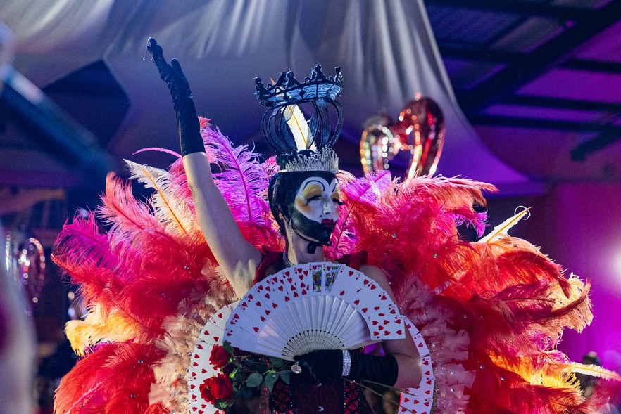 Drag queen Lady Angelica Macdeath in an elaborate costume for the “best dressed” category. For Saturday’s event, this category was themed “Drag King and Drag Queen of Hearts”.