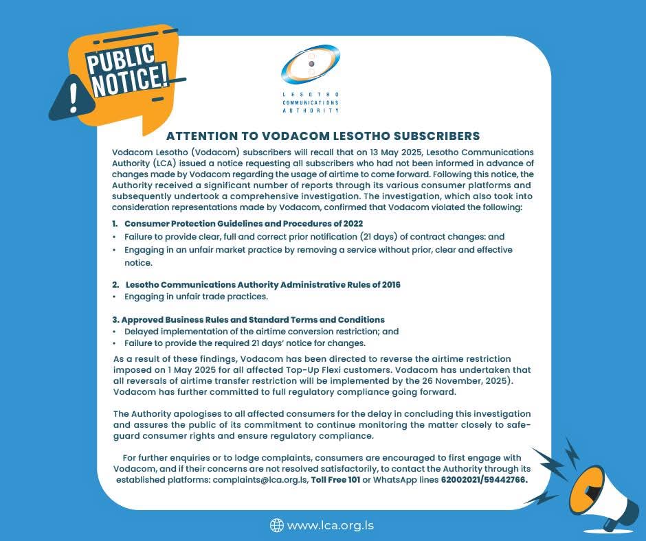 The Lesotho Communications Authority (LCA) says Vodacom failed to provide the required 21-day notice before altering contract terms, and by removing a service without clear prior communication it had engaged in an unfair market practice.
