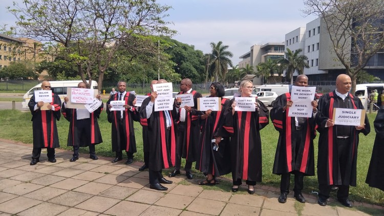 Dressed in their red and black robes, about a dozen magistrates downed their gavels to picket outside the court in Durban on Monday, demanding better working conditions and higher pay.