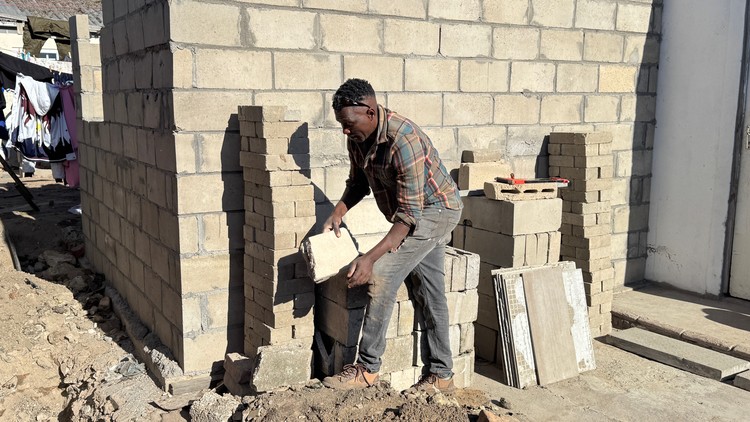 After a shack fire in 2022, Kolotla and about 40 others in the settlement started building brick-and-mortar houses. Kolotla’s house has three rooms. He designed it himself and laid the bricks by hand. He continues to build when he has money to buy materials. He plans to install a rainwater tank.
