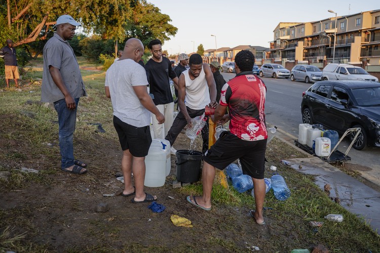 Residents in Midrand collect water from an illegally opened fire hydrant. Water trucks are difficult to find, they say.