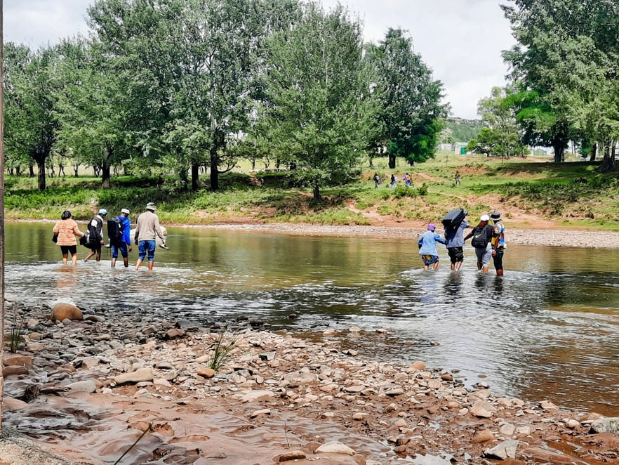 Within 30 minutes of our arrival, we saw about 70 people crossing the river, some carrying luggage, others carrying babies on their backs. They emerged from a narrow forest path on the Lesotho side and entered the water in groups of five to twelve.